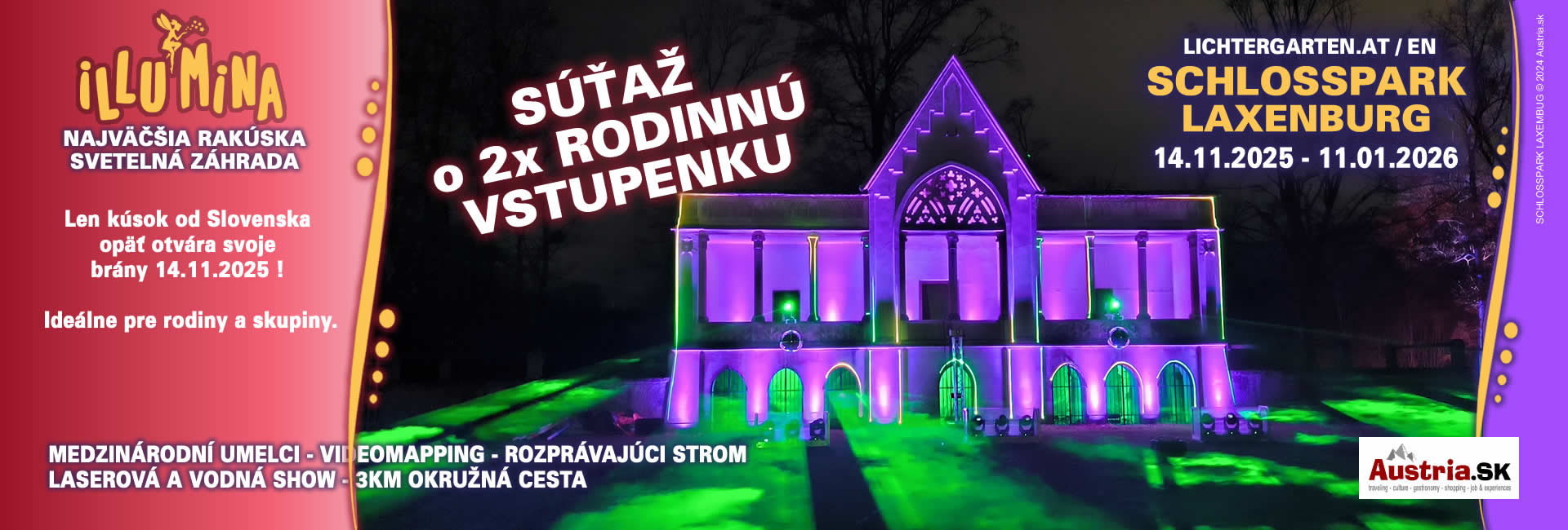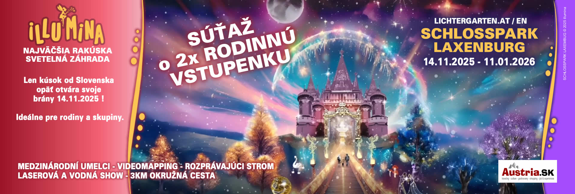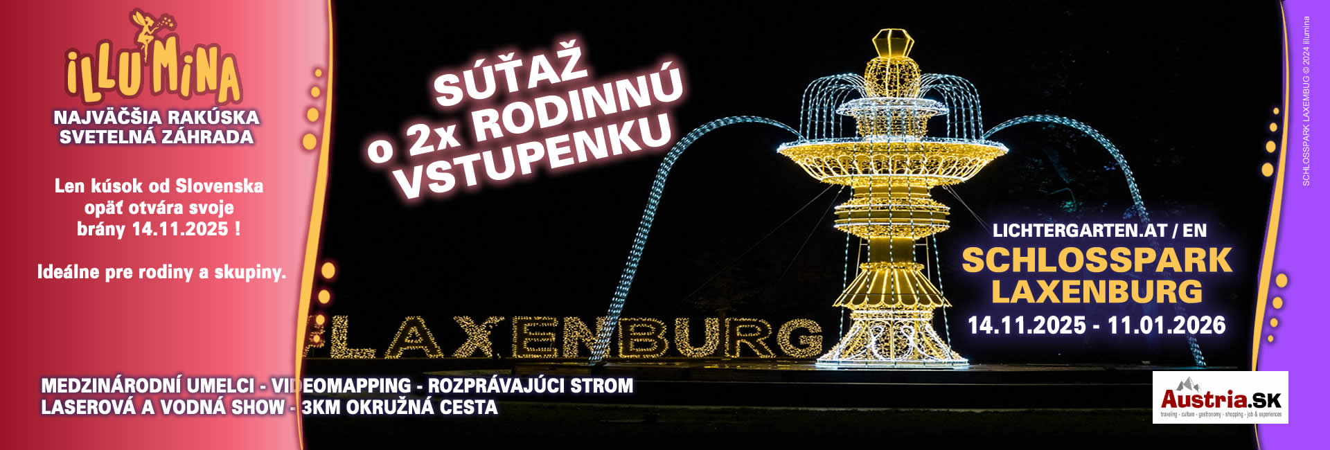 5 rokov mágie, svetla a zázrakov Aj tento rok sa opäť premení historický zámocký park Laxenburg na žiarivé more svetiel. Najväčšia záhrada svetiel v Rakúsku bude od 14. novembra 2025 do 11. januára 2026 lákať návštevníkov už 5. rok po sebe úplne novou okružnou trasou. Na viac ako 3 kilometroch čaká návštevníkov úchvatná cesta svetelných inštalácií, projekcií, laserových a vodných efektov. Vďaka moderným technológiám a spolupráci s medzinárodnými umelcami je zaručený nezabudnuteľný zážitok pre stálych hostí aj nových návštevníkov.